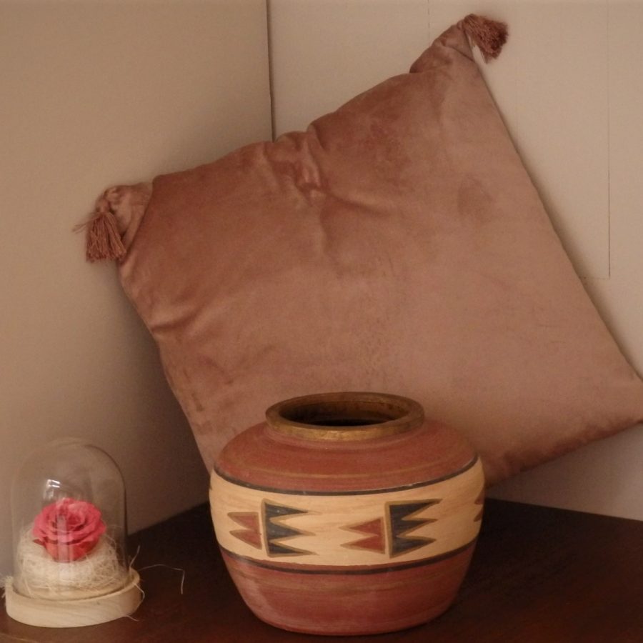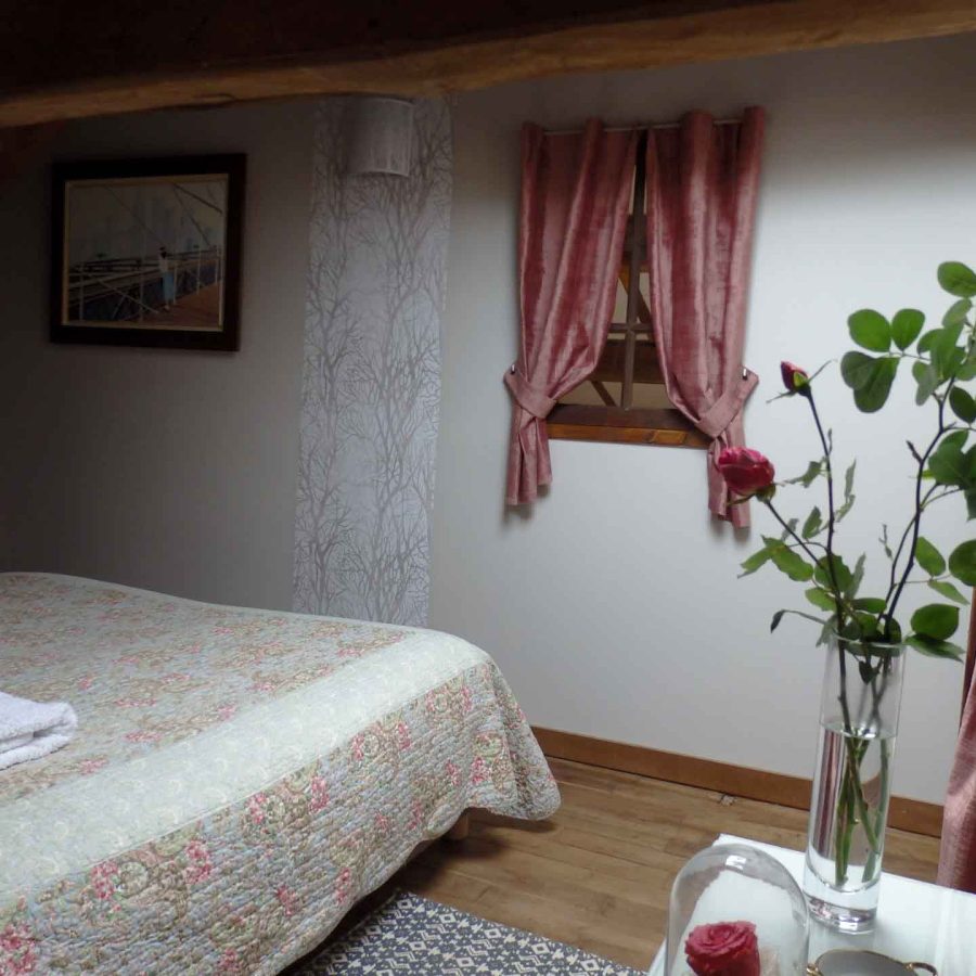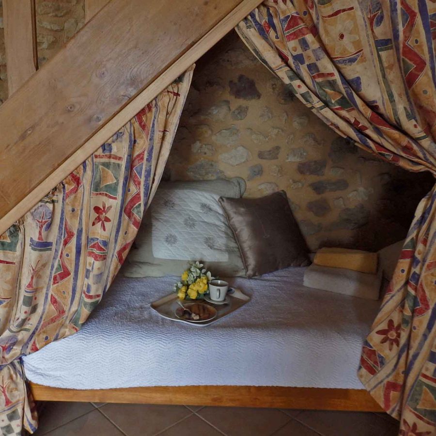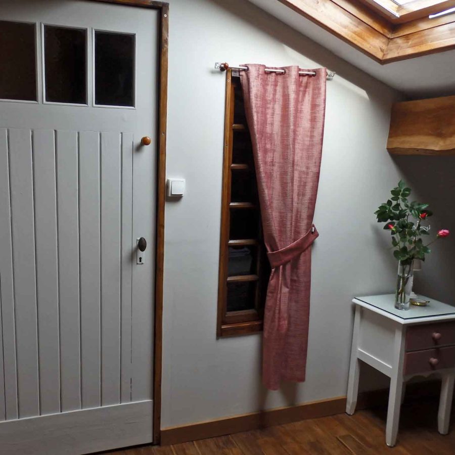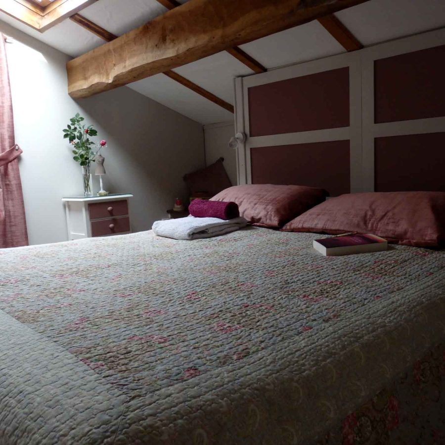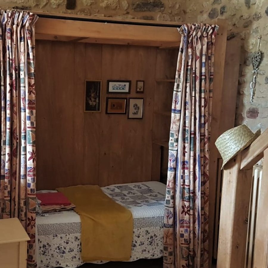 L’étage est composé d’une chambre pour deux personnes et d’un coin lecture ou repos en haut de l’escalier.