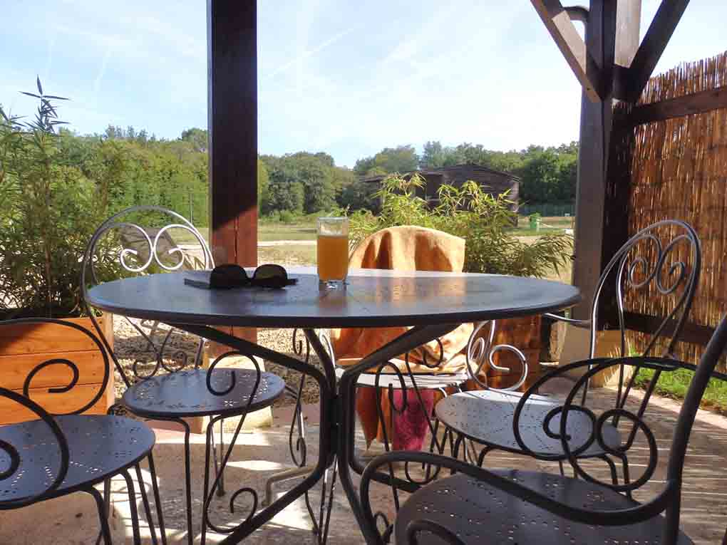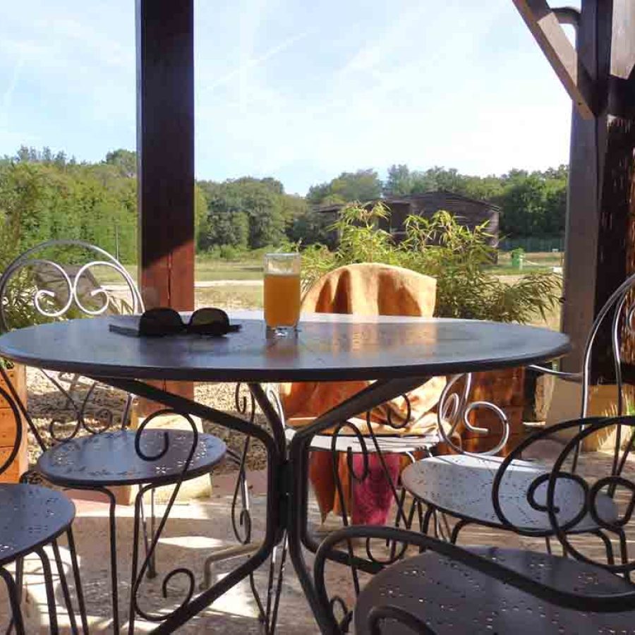 Situé en bout de longère, la terrasse du gîte a vue sur le practice de golf et l’allée bordée de noyers. A l’opposé, une autre porte donne sur une petite cour. A côté de la salle de jeux, les enfants peuvent jouer en toute sécurité sur les espaces à proximité.